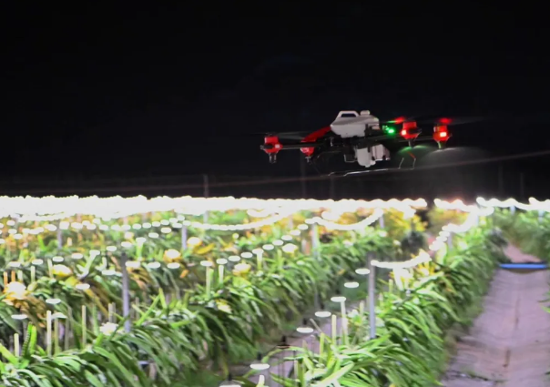 此外,无人机夜间打药,与白天相比也具有优势:夜间打药雾滴沉积数量比白天更多(约 42.82% ),覆盖面积比白天增加 51.04%,雾滴的穿透性更好,更加有利于病虫害的防治,而且还能提高作物对药物的吸收率,减少药物残留。得益于全自主飞行和 RTK 厘米级定位导航功能,极飞农业无人机夜间作业在果树飞防上也逐步得到广泛应用,如海南的火龙果和槟榔等。